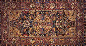1910年代にイラン、タブリーズで作られた「メダリオン絨毯」(820×385㎝)を手で足で体験できます。ロンドンのヴィクトリア&アルバート美術館蔵「アルダビル絨毯」の復元品として作られたアンティーク絨毯です。 |