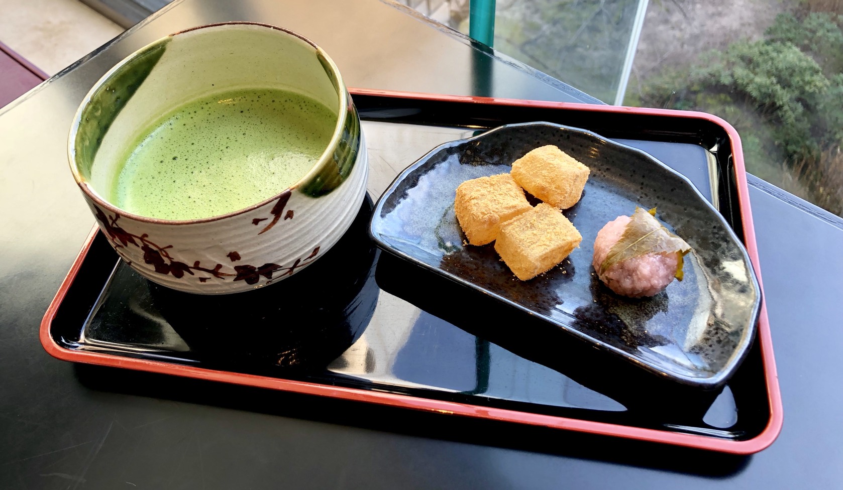 待ち遠しい春はすぐそこ。小さな桜餅ときな粉の彩りもやさしい、春のお抹茶のセット。