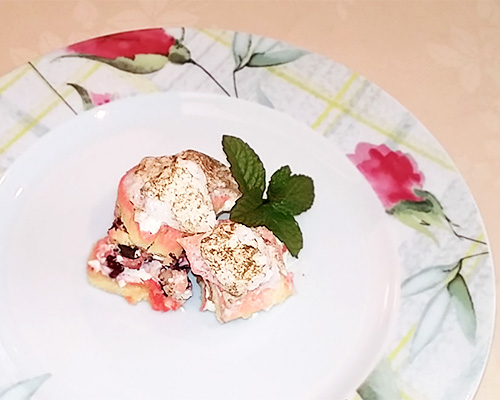ベリー、メレンゲを加え、それにチョコを振りかけピンク・白・黒と色彩の鮮やかなドルチェです。