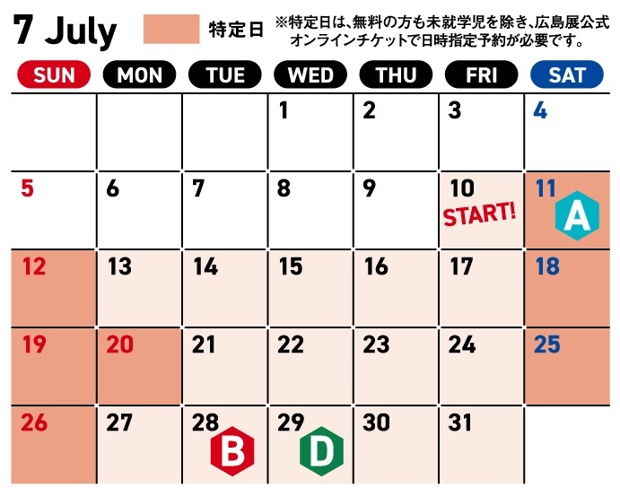 ※特定日(土日祝、8/10、8/12~14、9/14~18)は、無料の方も未就学児を除き、広島展公式オンラインチケットで日時指定予約が必要です。