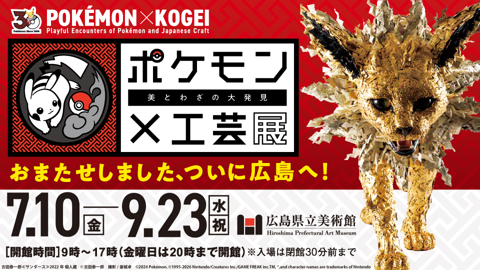 国内外を巡回してきた大人気展覧会が中国・四国エリア初開催!日本を代表する工芸作家たちが、ポケモンの姿かたちや仕草、ゲームのストーリーや世界観を多彩な技と素材で表現した約100点の作品を展示します。広島会場から加わる新作にもご期待ください。