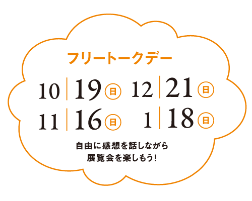 子供も大人も自由に感想を話しながら気兼ねなく展覧会を楽しんでいただけるよう、フリートークデーを実施。当日は下記イベントも併せて行います。